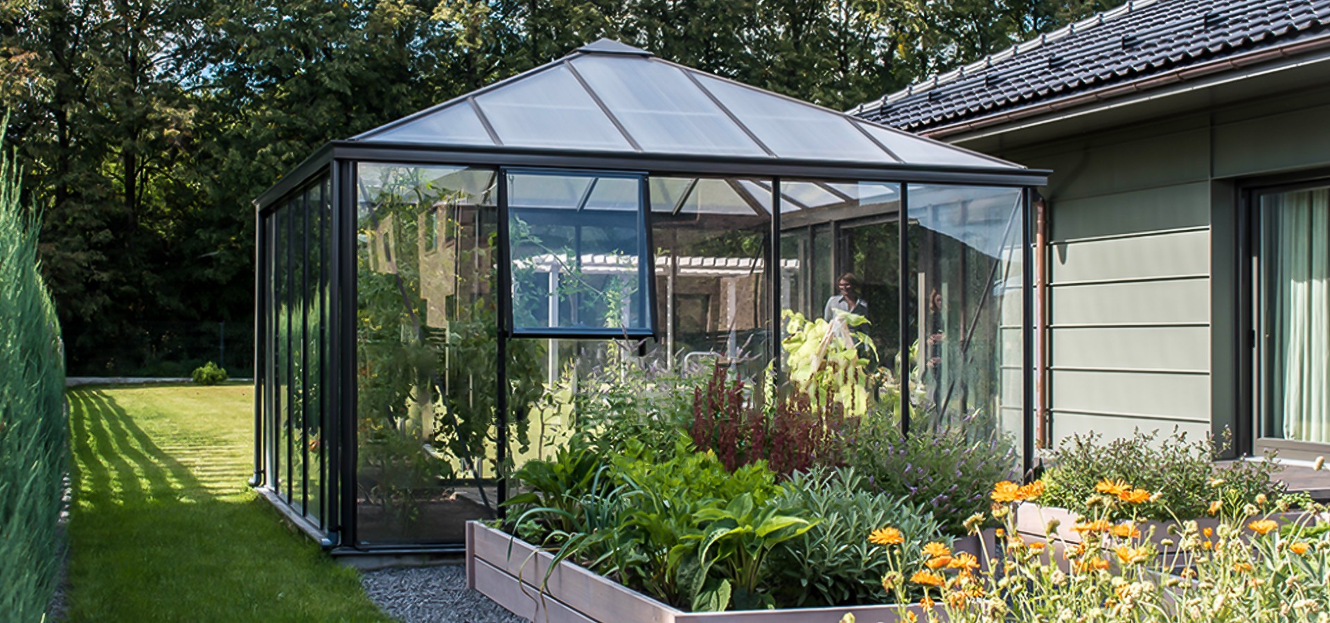 3,8 x 3,8 m OASE – den er optimale størrelsen for både små og romslige hager. For de som ønsker en romsligere struktur, tilbyr vi EXTRA OASE orangeri /drivhus (standard bredde men ønsket lengde – se bildet nedenfor).