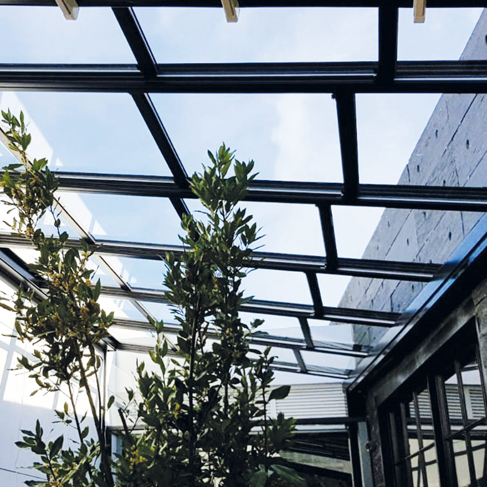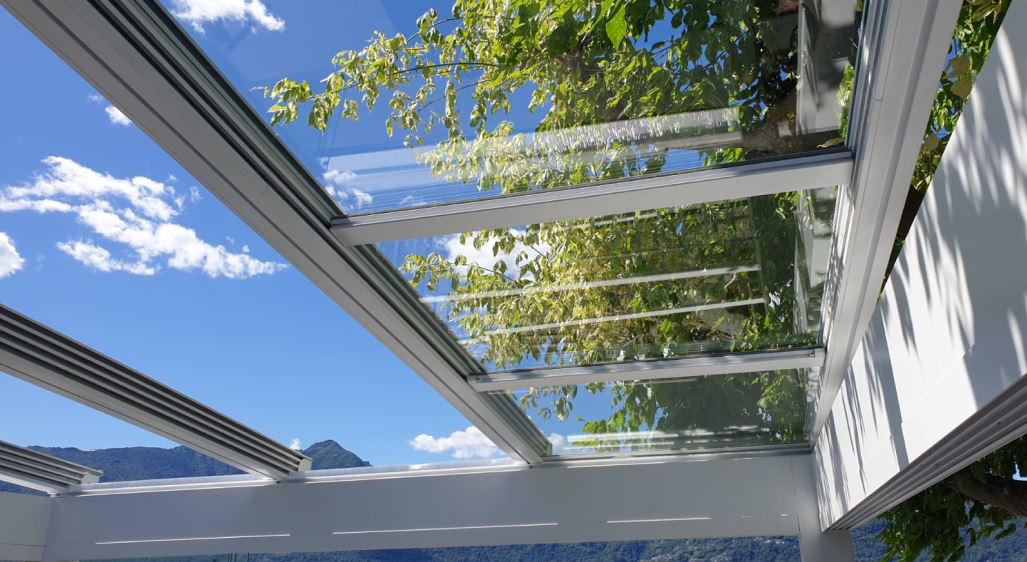 Takket være det motoriserte glasstaksystemet tillater terrassetaket SKIEN gradvis ventilasjon av det overbygde rommet, ved at åpningen av panelene kan justeres etter ønske. Det er et system som ikke er sesongbasert, og sikrer bruk hele året. Dets effektivitet og allsidighet gjør det til det perfekte produktet for ethvert uteområde.