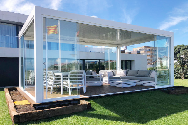 Dette glassinnkapslingssystemet er en ideell løsning for verandaer og terrasser. Den gjør det mulig å nyte uteområdet på en komfortabel måte og samtidig gi full panoramautsikt, takket være skyve- og foldepanelene som kan flyttes helt ut til siden.