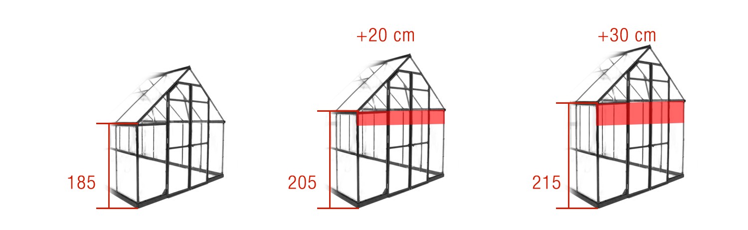 Hvis du vil ha et enda høyere drivhus, kan du bestille +20 eller + 30 cm hevet sidevegg (den totale høyden på drivhuset endres tilsvarende). Ikke bare gir dette mer plass for plantene å vokse på, det gir bedre luftsirkulasjon inne i bygningen, men det vil også gjøre det lettere for deg å jobbe og hvile i et slikt drivhus.