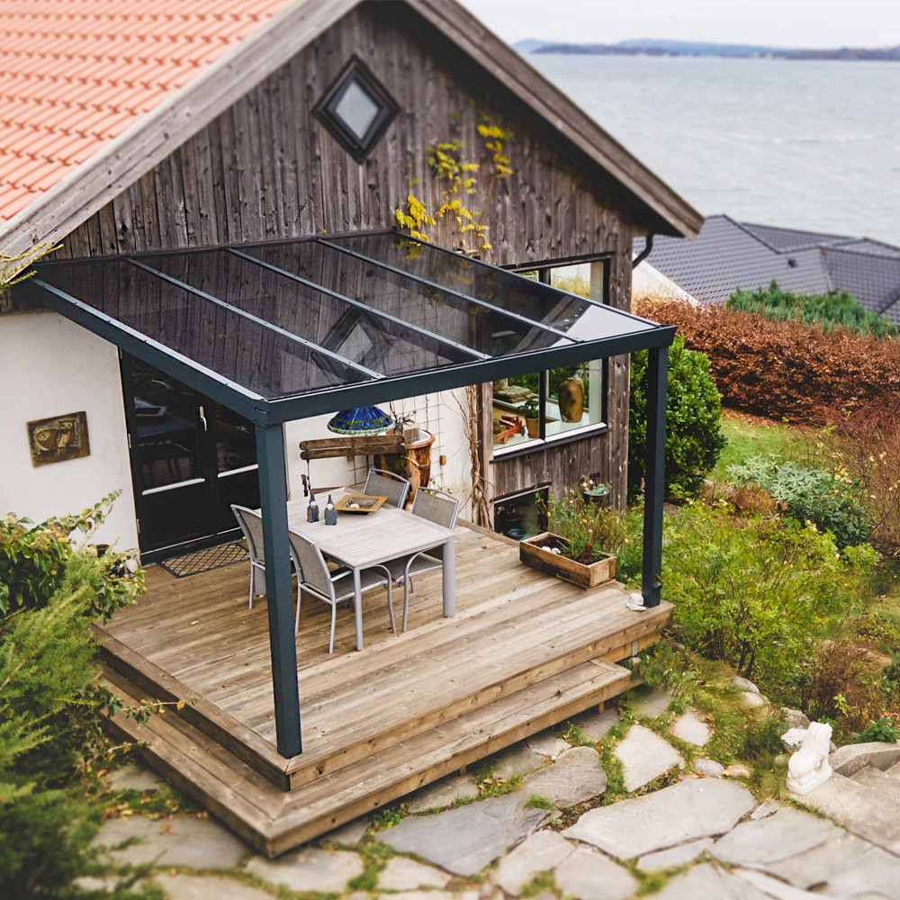 Opal og brun kanal polykarbonatbelegg på NORD ROOF XS terrassetak. Foto Uteluksus