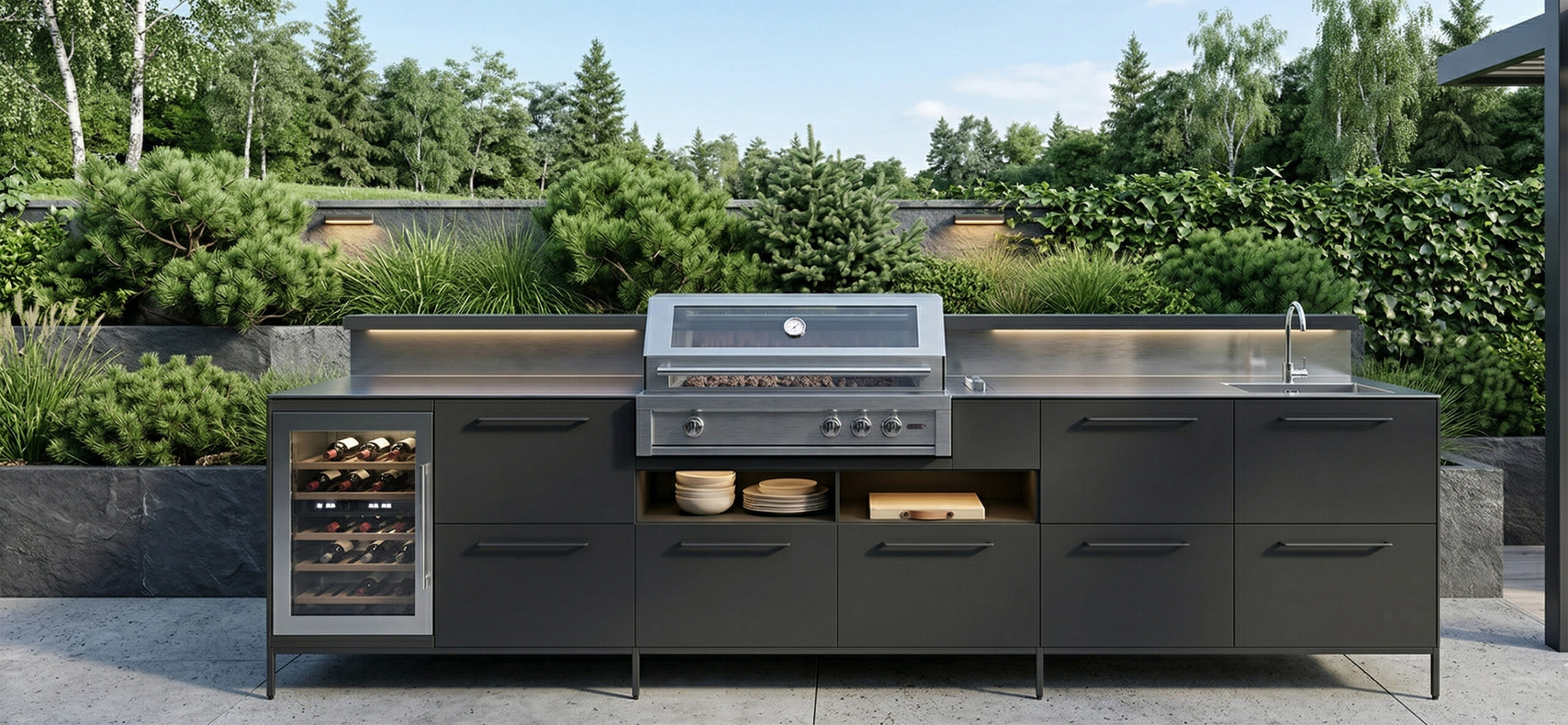 Våre utekjøkken lages på bestilling og tilpasses ditt uterom. Med aluminiumsramme, fronter i metall og benkeplate i rustfritt stål får du en slitesterk og stilren løsning med lang levetid.