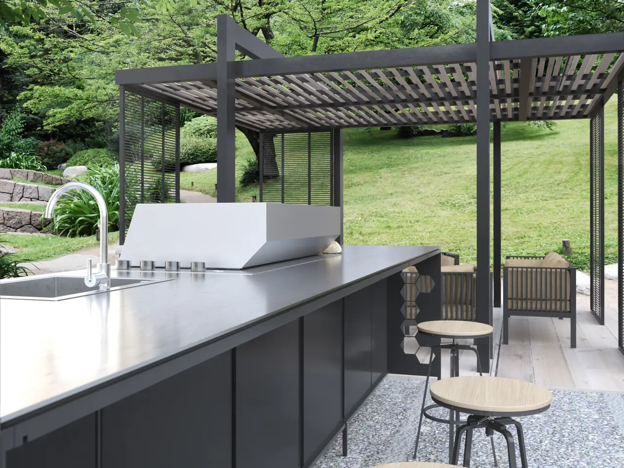Våre utekjøkken lages på bestilling og tilpasses ditt uterom. Med aluminiumsramme, fronter i metall og benkeplate i rustfritt stål får du en slitesterk og stilren løsning med lang levetid.